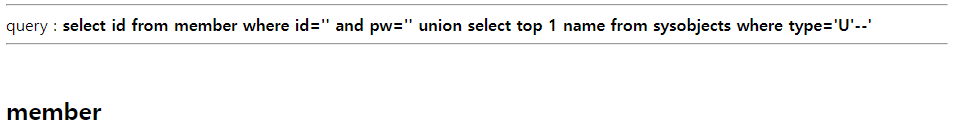 1번 ROW에는 member 라는 table 이 살고 있다.
