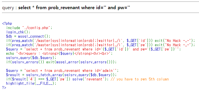 이번에도 mssql 환경이다. 필터링은 이전 문제와 비슷한 것 같다. Error 처리하는 부분이 있어서 이번 문제도 Error Based SQL Injection 일 수도 있겠다. 마지막 solve 부분에 다음과 같은 주석이 달려있다.