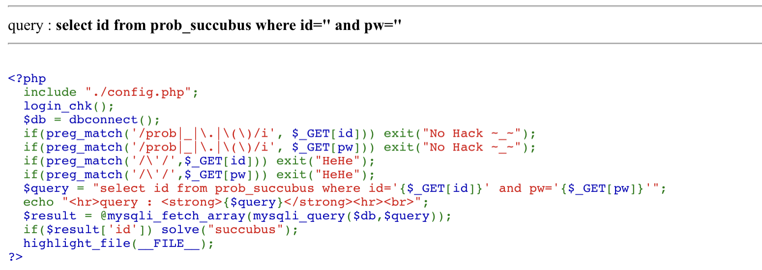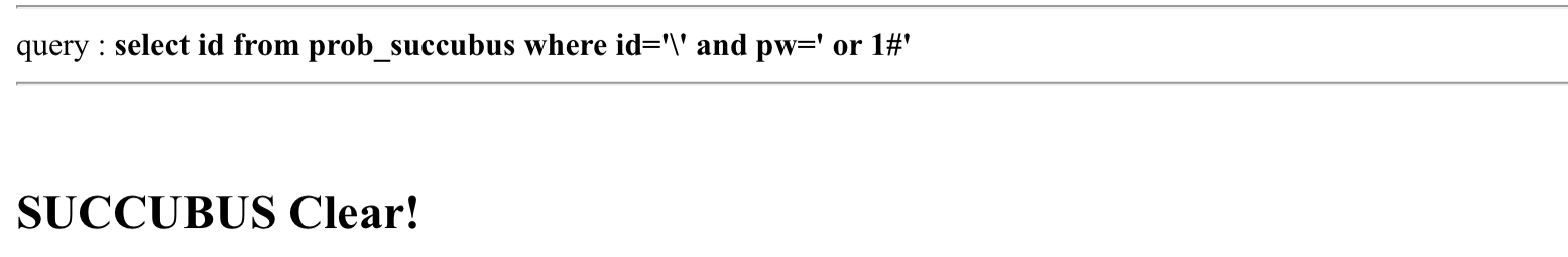 select id from prob_succubus where id='\' and pw=' or 1#'