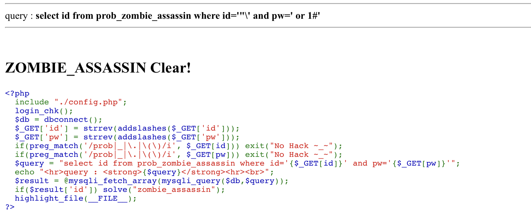 addslashes 함수는 GET 방식으로 받아온 데이터에 싱글쿼터나 더블쿼터, 그리고 역슬래시가 있으면 해당 문자의 바로 앞에 역슬래시를 하나 더 붙여주는 역할을 한다. 예를 들어 query 문이 id=" 과 같이 전달되었다면, addslashes 함수를 거친 이후에는