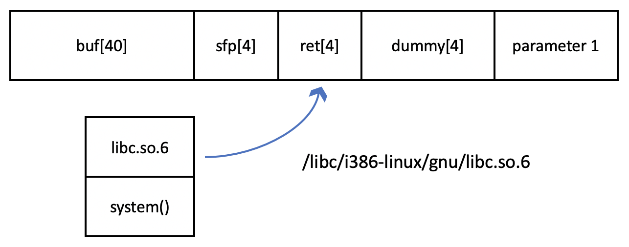 기존의 Buffer Overflow 처럼 RET를 libc.so.6의 system 함수 주소로 덮는다. 반면, 기존의 Buffer Overflow 와는 다르게 ret 뒤에 dummy + parameter 가 추가되었다. 여기서 parameter를 추가한 이유는 ret 주소가 libc.so.6의 sysytem 함수 주소로 덮이면 system 함수를 실행하는 데에 인자가 필요하기 때문에 인자를 넣어준 것이다.