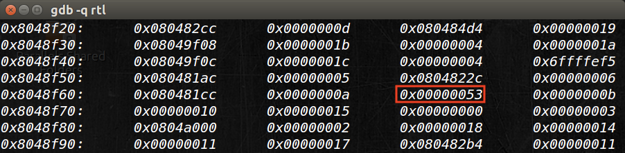우선 “/bin/sh” 문자열을 복사할 간단한 아스키코드를 찾아보자. 코드영역인 0x0848000에서 찾아봤더니 0x53, 즉 “S”가 존재하였다. 이 문자열에 해당하는 주소를 사용하자.