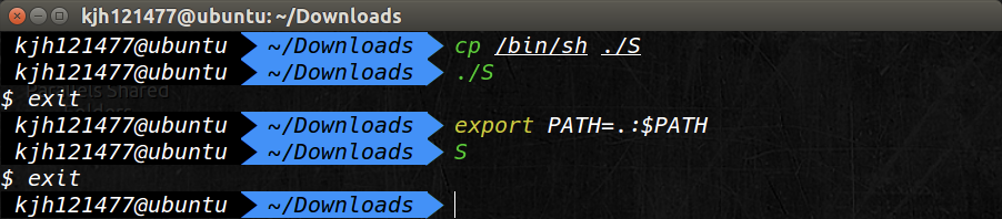 이제 이 문자열을 이름으로 한 실행파일에 “/bin/sh” 문자열을 복사하여 ./S 를 입력하더라도 쉘이 뜨도록 하자. 또한 현재 경로를 환경변수에 등록하여 S만 입력하여도 쉘이 뜨게 만들자.