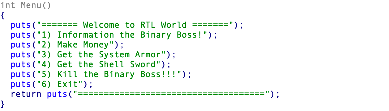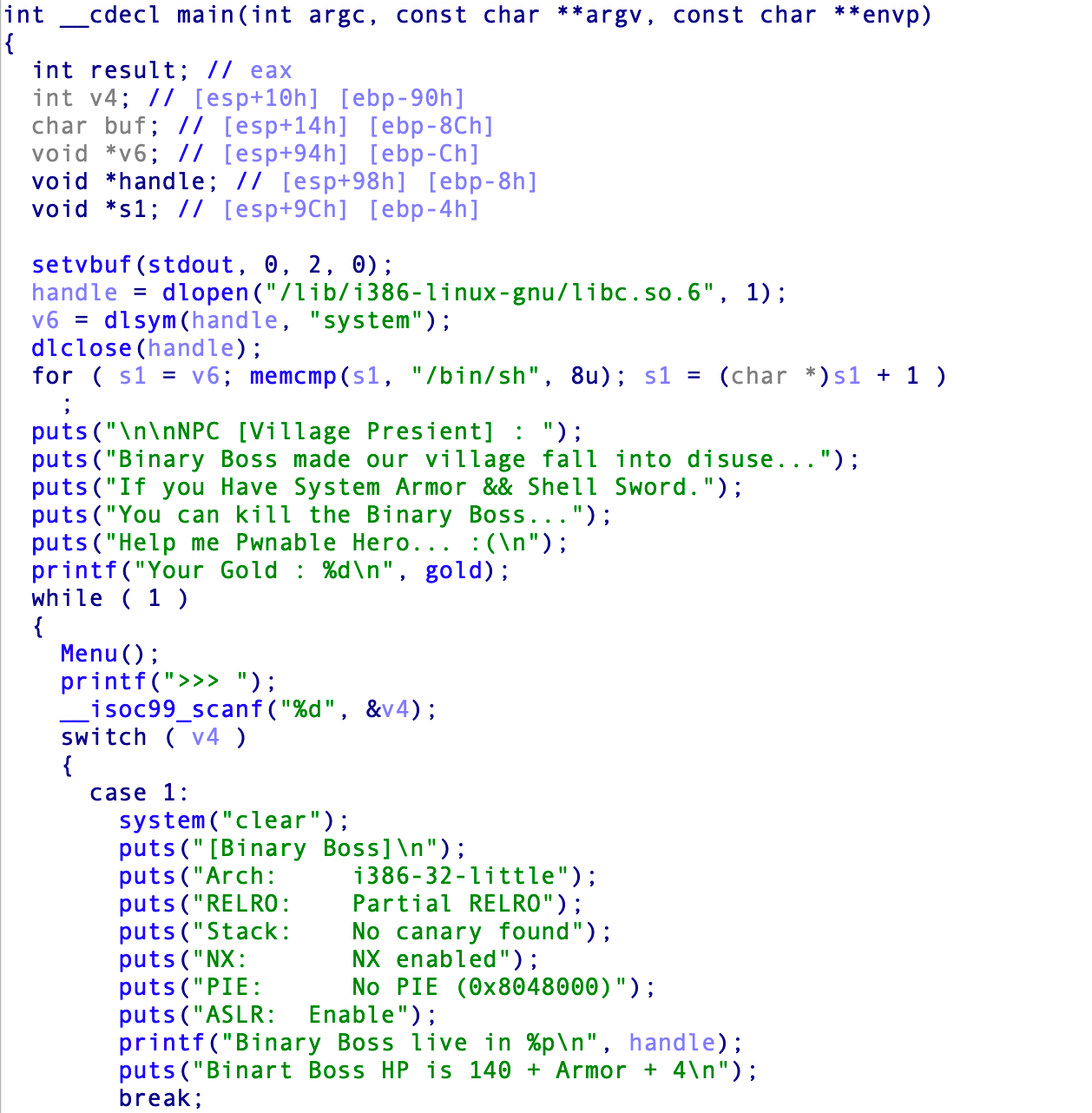 Menu 함수의 모습이다. 보스의 바이너리 정보 돈 만들기 등등이 있다.