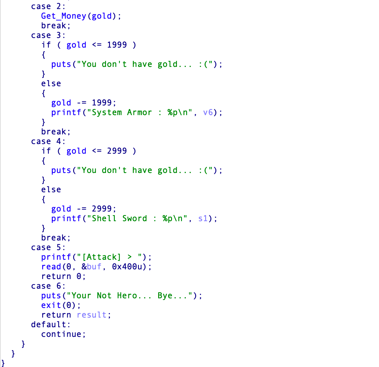 3번과 4번 메뉴를 이용하여 system 함수와 "/bin/sh" 문자열의 주소를 얻을 수 있다. 하지만 그 전에 돈이 있어야 하기 때문에 우선적으로 2번 메뉴를 이용하여 돈을 얻어야 한다. Get_Money 함수를 보면 2번 메뉴에서 다시 4번을 선택하면 rand() 함수를 이용하여 얻은 정수값을 gold 라는 변수에, 즉 돈에 추가된다. 귀찮게 1, 2, 3번으로 힘들게 돈벌지 않고 4번을 이용하여 한번에 떼존을 벌면 된다.